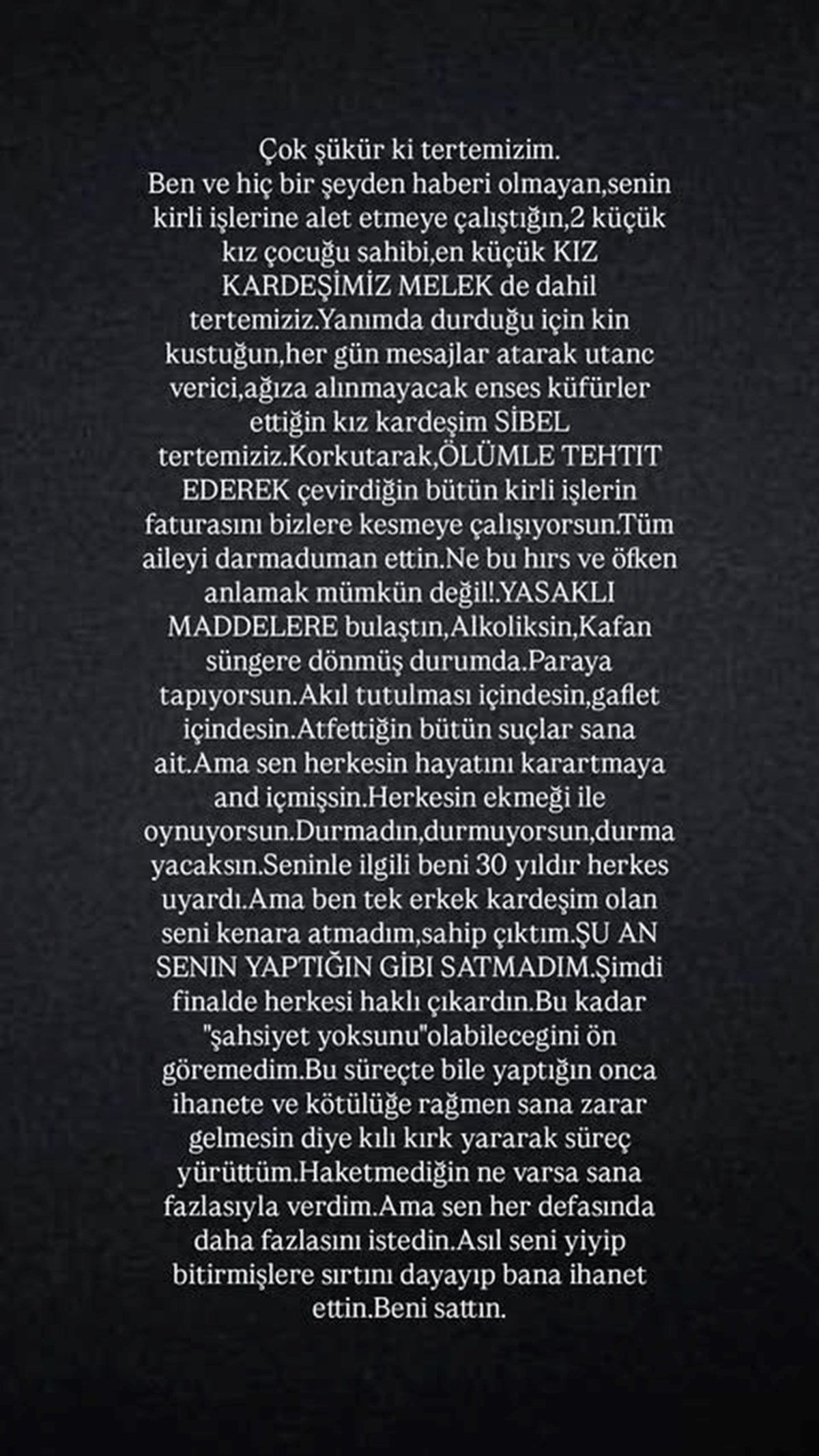 Ailesiyle yaşadığı sorunlarla bir süredir gündemden Özcan Deniz günler sonra sosyal medya hesabında açıklama yaptı. Ağabeyi Ercan Deniz'in yasaklı madde kullandığını ve alkolik olduğunu öne süren şarkıcı "Paraya tapıyorsun. Akıl tutulması içindesin, gaflet içindesin. Atfettiğin bütün suçlar sana ait" ifadelerini kullandı.Bir süredir ailesiyle yaşadığı sorunlarla adından söz ettiren Özcan Deniz, annesi Kadriye Deniz ve ağabeyi Ercan Deniz'in kendisine yönelik sözleri sonrası kalp spazmı geçirerek hastaneye kaldırılmıştı. Geçtiğimiz günler anjiyo olan Deniz sessizliğini bozdu. Ercan Deniz, kardeşi Özcan Deniz'i vergi kaçırmakla suçlamıştı.Bir süredir sessizliğini koruyan ve "Çok şükür ki tertemizim" diyen Özcan Deniz, ağabeyinin uyuşturucu bağımlısı ve dolandırıcı olduğunu öne sürdü:"Korkutarak ölümle tehdit ederek çevirdiğin bütün kirli işlerin faturasını bizlere kesmeye çalışıyorsun.Tüm aileyi darmaduman ettin. Ne bu hırs ve öfken anlamak mümkün değil! Yasaklı maddelere bulaştın, alkoliksin, kafan süngere dönmüş durumda. Paraya tapıyorsun. Akıl tutulması içindesin, gaflet içindesin. Atfettiğin bütün suçlar sana ait.Ama sen herkesin hayatını karartmaya and içmişsin. Herkesin ekmeği ile oynuyorsun. Durmadın, durmuyorsun, durmayacaksın. Seninle ilgili beni 30 yıldır herkes uyardı. Ama ben tek erkek kardeşim olan seni kenara atmadım, sahip çıktım. Şu an senin yaptığın gibi satmadım. Şimdi finalde herkesi haklı çıkardın.Bu kadar 'şahsiyet yoksunu' olabileceğini öngöremedim. Bu süreçte bile yaptığın onca ihanete ve kötülüğe rağmen sana zarar gelmesin diye kılı kırk yararak süreç yürüttüm. Hak etmediğin ne varsa sana fazlasıyla verdim. Ama sen her defasında daha fazlasını istedin. Asıl seni yiyip bitirmişlere sırtını dayayıp bana ihanet ettin. Beni sattın.""Benim adımı kullanıp dolandırdığın kim varsa bana ulaşıyor. 60 yaşına merdiven dayamış bir 'adamsın'. Neyin peşindesin bilen yok. Sen, benim bütün kazancımın kendi kazancın olduğunu zannediyorsun. (Karından bile sakladığın, sadece senin ve oğlunun bildiği yurt dışına kaçırdığın paramın izini buldum). 'Ekmeğimle oynadı' cümlen bu yüzden" diyen şarkıcı sözlerine şöyle devam etti: "Madem ben yiyemiyorum kendisi de karısı da çocuğu da yiyemesin diyorsun. O yüzden ekranlarda 'Benim param yok ama o hala kazanıyor' diyorsun. Belden aşağı saldırıyorsun. Ahlaksızca karımı diline doluyor iftiralar atıyorsun. 40 yıllık bütün birikimimi heba ettin."Özcan Deniz açıklamasını şu sözlerle tamamladı: "Şimdi de kendi kendini rezil ettiğin ekranlarda, kendini temize çıkartmaya çalışarak daha da rezil ediyorsun. Seninle ilgili artık hukuksal işlemleri başlattım" diyen şarkıcı "Suçlu psikolojisi içindesin. Bu yüzden ekranlardan inmiyorsun. Utanç verici bir amaç güdüyorsun. 'Beni bitirmek'. Ben senin sayende değil, sana rağmen ördüm bu kariyeri. Sahtekarlıkla sarsılmaz. İlahi adalet için zaten Allah yardımcın olsun."Öte yandan Özcan Deniz son paylaşımında "Adımın karşısına koyamadığınız sıfatları benden de beklemeyin artık. Beni evlat, kardeş olarak göremeyip 'RAKİP' olarak görüp yaptığınız düşmanlıkların ayıbıyla, günahıyla yaşayın" ifadelerini kulandı. Ünlü sanatçı sözlerini şöyle tamamladı: "Bugün evimi başıma yıkmaya, yuvamı dağıtmaya çalışan sizleri Allah'a havale etmiyorum, Allah'a emanet ediyorum. Haklının acelesi yoktur. Sabırlıyım ve de başaramayacaksınız!" Tartışmalar devam ederken Deniz'den dikkat çeken bir paylaşım geldi. Deniz, eşi Samar Dadgar, oğlu ve dostlarıyla birlikte verdiği pozu takipçileriyle paylaştı.